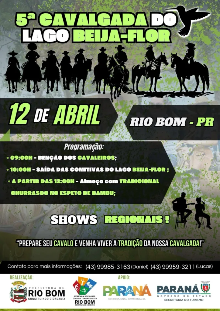 A Prefeitura de Rio Bom, por meio da Secretaria Municipal de Esporte, Cultura, Turismo e Lazer, promove no próximo dia 12 de abril a 5ª Cavalgada do Lago Beija-Flor. O evento já se tornou tradição no município e celebra a cultura sertaneja e as raízes do campo.
