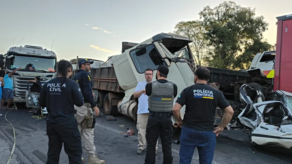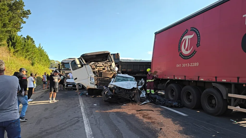 Segundo informações iniciais, ainda a serem confirmadas pelas Polícia Rodoviária Federal, a ocorrência envolveu quatro caminhões e dois veículos. Uma pessoa morreu. A vítima fatal estava em uma Fiat Strada branca, com placas, a princípio de Ivaiporã, e teria aproximadamente 40 anos.