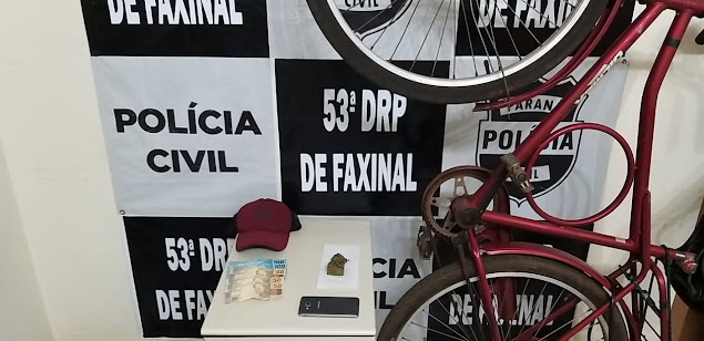 MAIS PRISÕES A Polícia Civil, de Faxinal, comando do Dr. Ricardo Augusto de Oliveira Mendes, prendeu em flagrante, na data deste dia 16 de setembro, de 2020, por volta das 12 horas, na Rua Santos Dumont, Centro, um jovem, de 23 anos, cujo nome não foi divulgado, mas segundo um cidadão, que disse apenas amigo, trata-se de Cleiton Rafael de Oliveira. A prisão foi por suspeita de envolvimento com a prática do crime de tráfico de drogas. O Setor de Inteligência da 53ª DRP - Delegacia Regional, recebeu denúncia anônima dando conta de que havia uma pessoa vindo do Estado de São Paulo, usando um boné vermelho e conduzindo uma bicicleta vermelha, a qual iria realizar a entrega de maconha no local citado. De posse desta informação, os investigadores se dirigiram ao local, onde permaneceram em campana e flagraram o suspeito, em cuja posse foram encontrados 40 (gramas) de maconha; dinheiro em notas de valores diversos; um celular, possivelmente, usado para contato com usuários/compradores e uma bicicleta vermelha. O preso, a droga, dinheiro e objetos, foram encaminhados à Delegacia para providências de praxe. Vale ressaltar que, nos últimos dias, quase 20 pessoas já foram presas por tráfico, numa ação eficiente da PC, no combate a esse tipo de crime.