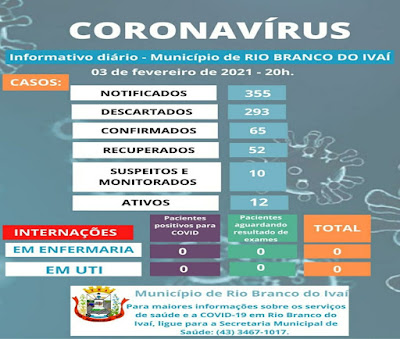 Em Rio Branco do Ivaí, a Secretaria Municipal de Saúde, fez um alerta, por conta do aumento de casos de Covid. Recentemente o Blog do Berimbau e a Rádio Nova Era, entrevistaram o prefeito Pedro Taborda, o qual revelou que ele, a primeira dama e a filha, também foram infectados com a Covid. No dia 03 de fevereiro, de 2021, a cidade chegou a 65 casos confirmados. Para alertar a comunidade, uma carro de som foi colocado nas ruas, com a seguinte mensagem: "Atenção População de Rio Branco do Ivaí, considerando o aumento de casos de Coronavírus no município, a Secretaria de Saúde pede a toda população que redobre os cuidados de prevenção, seguindo todas as recomendações do Ministério da Saúde. Evite aglomerações, só saia de casa em caso de necessidade. É indispensável o uso de máscaras para transitar nos ambientes, não se esqueçam de lavar frequentemente as mãos e fazer o uso de o álcool em gel. Cuide de você e de quem você ama", diz a nota. Na imagem, a direita, veja os dados da covid, publicados no boletim de 03 de fevereiro.