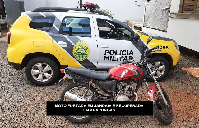 A equipe da Polícia Militar de Arapongas, que estava de plantão, no dia 18 de janeiro de 2023, conseguiu recuperar uma motocicleta furtada em Jandaia do Sul. O veículo foi encontrado na Rua Capitão do Mato, e foi avistado pelos soldados. Era uma Yamaha/YBR 125e, de cor vermelha, cuja placa aparentava ser falsificada. Ao ser consultada, foi verificado constar alerta de furto em data de 28 de dezembro de 2022, conforme boletim registrado em Jandaia. A responsável pela motocicleta identificou-se e afirmou que seu marido era o proprietário e que ele adquiriu em dezembro, pagando R$600,00. Ela então ligou para ele, que compareceu ao local, divergindo, afirmando que pagou mil reais, pois ela estava danificada em acidente. A compra, segundo ele, foi em Mandaguari, cujo vendedor somente identificou como Erik. Diante dos fatos, o homem foi levado para a Delegacia, onde prestaria esclarecimentos. FURTOS -  Ainda, em Arapongas, alguns furtos foram registrados em 18 de janeiro, um deles, no  Bairro Colônia Esperança, levaram uma Motocicleta Honda/XR 200r, cor vermelha, placa AFE-7817, que estava estacionada em uma estrada rural próximo de onde a vítima  estava trabalhando.