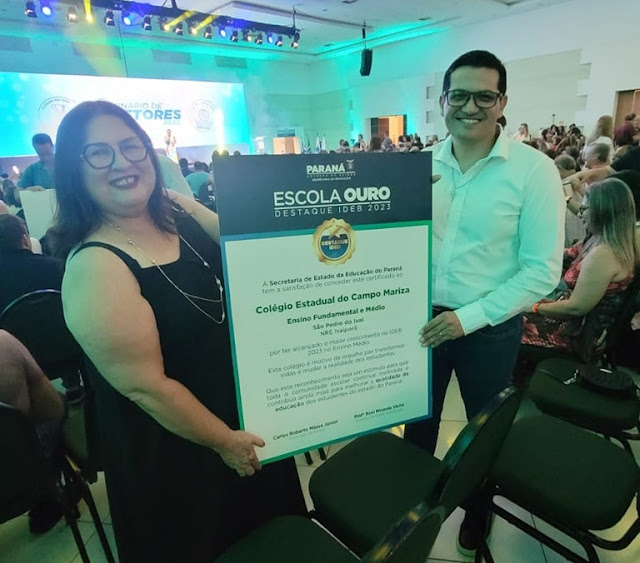 A Diretora do Colégio Estadual do Campo Mariza - Ensino Fundamental e Médio, no Distrito Marisa, em São Pedro do Ivaí, Eliana Aparecida Vivan, esteve em Foz do Iguaçu para participar do Seminário de Diretores, onde recebeu o Prêmio Escola Ouro pelo maior crescimento do IDEB no Ensino Médio em 2023. Emocionada com a conquista, a Gestora expressou sua felicidade e agradeceu a toda a equipe escolar, incluindo Professores, Pedagogos e Colaboradores, pelo empenho e dedicação ao longo do ano. "Este prêmio é resultado do esforço coletivo e do comprometimento de todos que fazem parte da nossa escola", destacou Eliana. A Administração Municipal, por meio do Prefeito Rildo Bernardes de Camargo e da Secretária Municipal de Educação, Luciana Fonseca, também parabenizou o Colégio pelo excelente desempenho. O Prefeito Rildo da Padaria enfatizou: "Este é o fruto de muito trabalho, esforço e união de todos os envolvidos." A Secretária de Educação, Professora Luciana, elogiou a conquista como um marco na evolução pedagógica do município e uma fonte de inspiração para outras escolas: "Agradecemos a todos que contribuíram para este resultado significativo e uma conquista importante. Que ele sirva de exemplo para os demais colégios da cidade". (Assessoria - Neri Lobo)